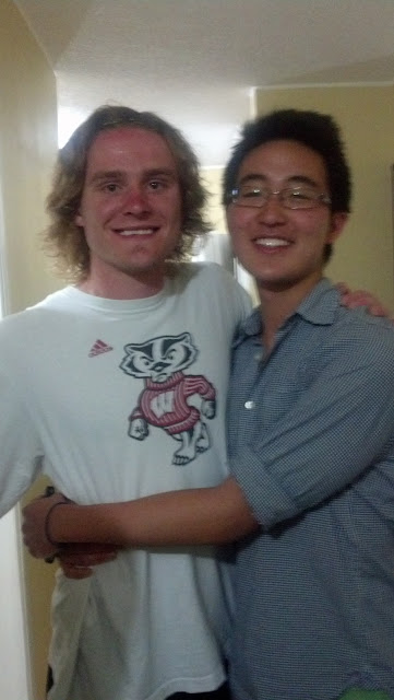 I led the trot over to the park. We had to hurry somewhat for the bus was to leave soon. I had already started to sweat by the time we got there -- shaping up to be another hawt one. Keon, Eddie, and Pete took some pictures with their cameras from the platform, then Pete, Eddie, and I posed for a roommates photo. It turned out spectacularly well.